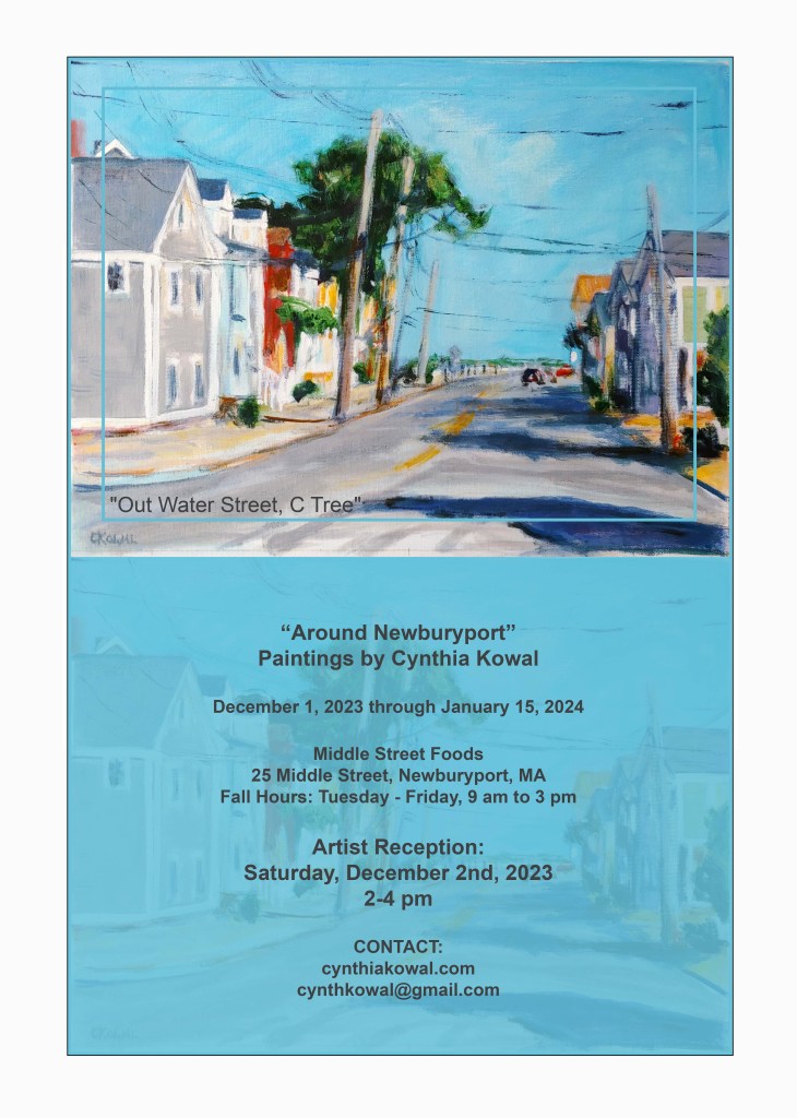 My work reflects a colorist’s sensibility and ideas about place and season. The overall goal is to communicate a sense of enjoyment of living here. This show’s paintings “Around Newburyport” were inspired by regular walks from my home in the South End. I see compositions naturally pop up to show off the charms of daily life all over the area. The buildings and streets have a quirkiness of line and shapes, and I love to look for the blue Merrimack River often visible within street views. Animals and people are always fun to paint. Maritime subjects are challenging because convincing knowledgeable people is important. Generally, my compositions include a variety of changing light, weather, and seasons. Most work was created in the studio based on a quick cellphone pic in portrait mode, often shot in the middle of the street for a whole look. This immediacy captures a landscape sweep with limited elements and details to work in paint. The reference pic is the jumping off point. It may be cropped to play to an interest, or to suit a selected size for a painting. All other decisions come from the eye, the heart, the color palette, and the brush. Sometimes, another walk-by helps to understand real spaces, and get past the camera’s trick of compression. I work towards an authentic result by developing details of line and color with brushwork. I accept my work as representational, vibrant and expressive. I want to achieve a crisp quality with enough looseness so the viewer shares a role for taking it all in. I am grateful to Middle Street Foods, wonderful provisioners and hosts for this opportunity to show work on their gallery wall. I love being local.